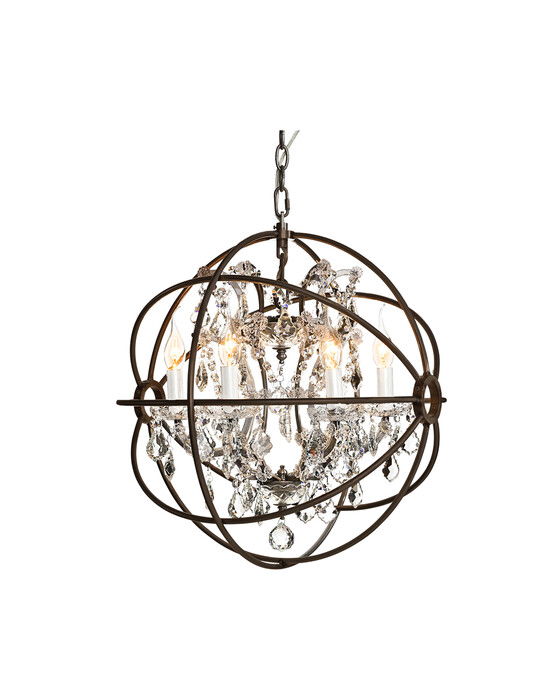 En prålig takkrona där det exklusiva och eleganta från en kristallampa möter det moderna, industriella och utmanande i metall med rostig finish. En blickfångande lampa med en kedjelängd på 75 cm och plats för totalt 6 ljuskällor (ljuskällor ej inkluderade).