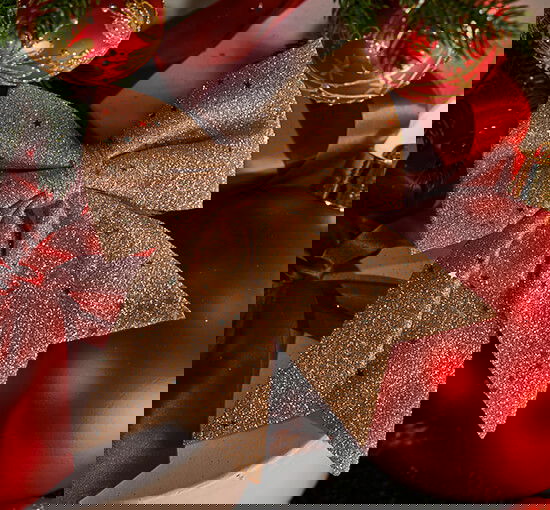 Skimrande juldekor i form av en vacker rosett täckt i champagnefärgat glitter som glimrar fint i hemmet och drar blickarna till sig. Rosetten kan användas för att dekorera julgranen, bordsdukningen eller dina julklappar. Bara fantasin sätter gränser.