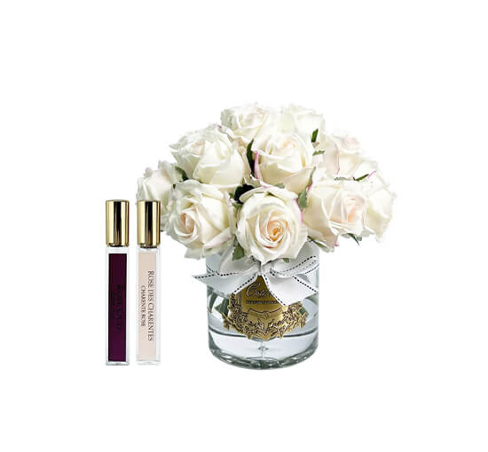 Roses de luxe är ett exklusivt set med en dekorativ blombukett som du sprayar med medföljande rumsparfym. Den frodiga buketten består av ljust rosa rosor av högkvalitativt konstmaterial i en glasvas med tjusigt vitt tygband och guldigt emblem. Genom att applicera doften på blommornas blad får du en bukett och diffuser i ett. De vackra naturtrogna rosorna bärs upp av en gelé som ger stadga och hjälper buketten att hålla formen. Blombladen är handgjorda och har en tunn beläggning som gör att de ser ut och känns som äkta blommor. Roses de luxe ingår i vår serie exklusiva konstblommor och dofter från Côte Noire.