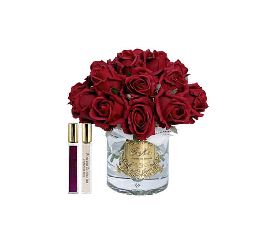 Roses de luxe är ett exklusivt set med en dekorativ blombukett som du kan spray med medföljande rumsparfym. Setet består av en glasvas med högkvalitativa konstgjorda röda rosor, ett vitt tygband och ett guldigt emblem som ger en lyxig touch. Med doften applicerad på blommorna får du både en vacker bukett och en doftavdunstare i ett. Dofterna Rose des Charantes och Rose Oud ger en autentisk doftupplevelse som för tankarna till det franska landsbygdslivet.