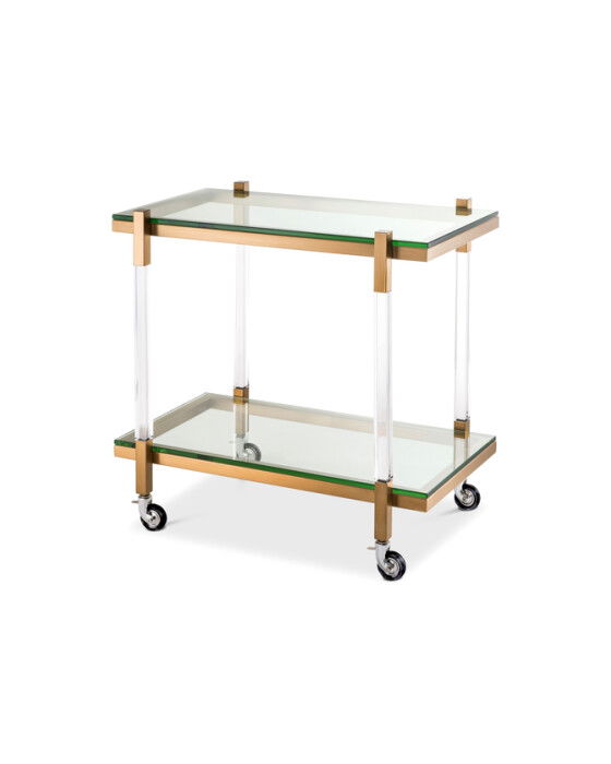 Den eleganta drinkvagnen från Eichholtz med glasshyllor, ben i borstad mässing och akryl är en perfekt inredningsdetalj för att visa upp dina finaste flaskor och glas eller dekorera med favoritblomman och nypolerade ljustalken. Oavsett användning kommer den imponera på alla gäster.