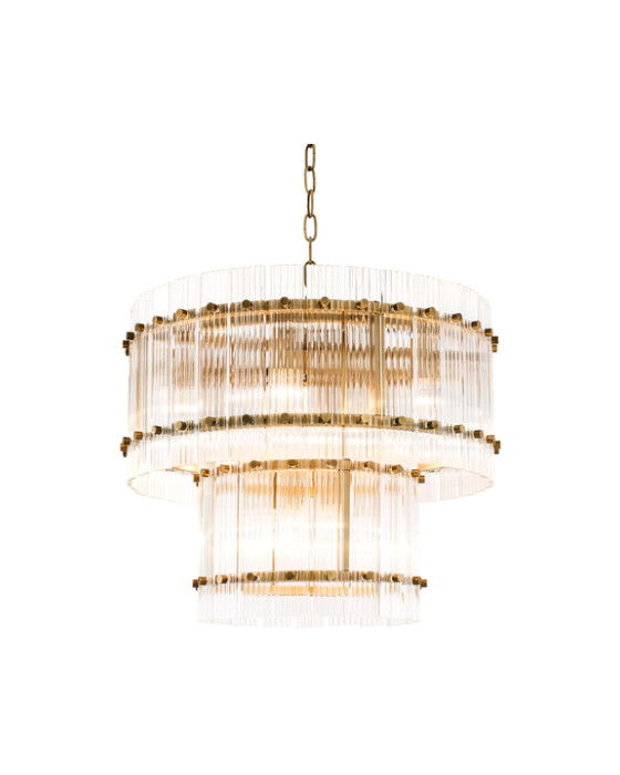 Skapa en glamorös och modern atmosfär med Ruby S ljuskrona. Denna 10-ljusarmatur i antik mässingsfinish är en modern tolkning av klassisk stil och har en avsmalnande tvådelad design med rader av ribbat klarglas.
