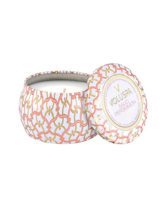 Voluspa Saijo Persimmon är ett lyxigt doftljus gjort av krämig kokosvax som sprider en kraftfull doft av japansk persimon och röda vinbär. Ljuset brinner med en klar låga och har en lång brinntid. Förpackat i en vacker plåtburk med mönster i rosa toner, ger detta doftljus en trivsam och elegant atmosfär till ditt hem.