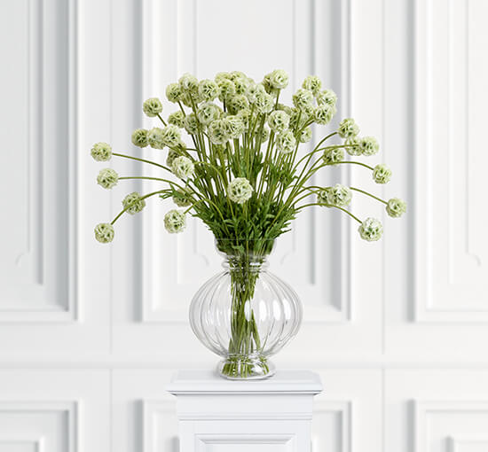 Denna konstgjorda scabiosa har tre vackra blommor i mjukt gröna toner och smala, eleganta stjälkar. Med sitt naturliga utseende passar den perfekt i buketter eller som en enkel och stilfull detalj i en vas. Ett hållbart alternativ som bevarar sin skönhet över tid.