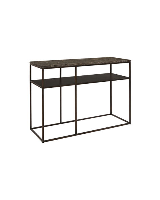 Scala Marble konsolbord dark brown / bronze är en elegant möbel med en skiva av mörkbrun marmor och bronserade ben. Med sina mått på w 110 d 40 h 81 cm passar detta konsolbord perfekt i hallen eller vardagsrummet.