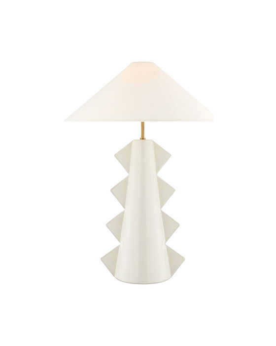 Den Senso bordslampan i färgen Ivory är designad med räta vinklar och raka linjer i staplade ziggurater i keramik. Den har en skärm i linnetyg som kompletterar dess moderna och geometriska design med en unik dragningskraft. Denna eleganta och distinkta lampa kommer att höja alla interiörer med en touch av finess.