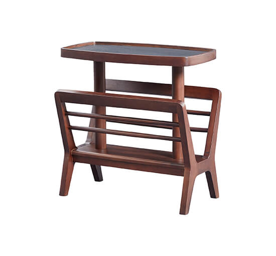 Detta stilrena sidobord med tidningsställ kombinerar praktisk funktion med estetisk design, vilket ger en tidlös och modern känsla till ditt rum. Den varma trätonen och de mjukt vinklade linjerna ger möbeln en inbjudande karaktär som passar både klassiska och samtida hem perfekt. Med avställningsyta och förvaring är detta sidobord en harmonisk och funktionell möbel för alla läsälskare och inredningsentusiaster.