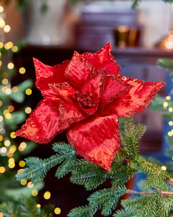 Denna stora och dekorativa tygblomma i röd färg med charmig glitterdekor i kanterna är perfekt för att placeras i granen eller som dekoration på julbordet. Blomman fästs enkelt med en klämma undertill.