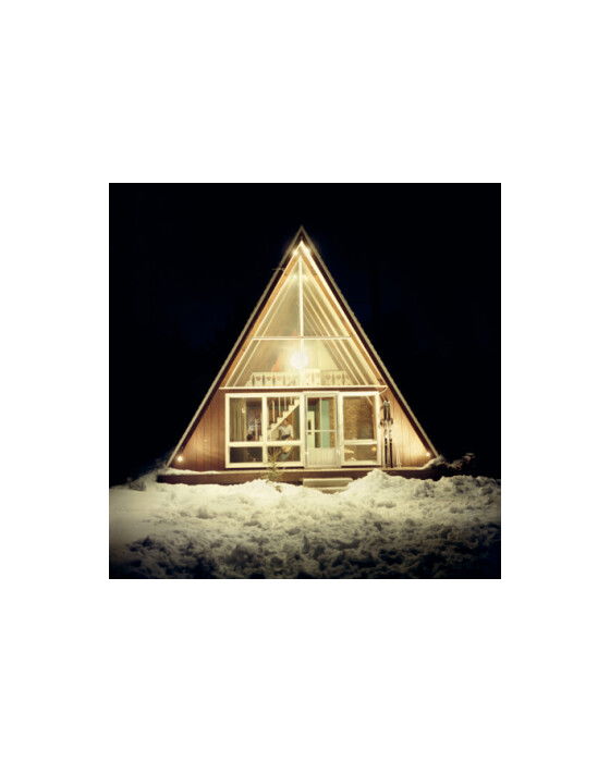 Det glasframsiktiga triangulära Skaal House, upplyst på natten, i skidorten Stowe Mountain i Stowe, Vermont, 1962. Ett par skidor lutade mot väggen bredvid dörren. Välj mellan att få konstverket levererat komplett med klassisk inramning i en svart eller vit träram, monterat utan ram på akrylglas eller levererat utan ram tryckt på premiumfotopapper.