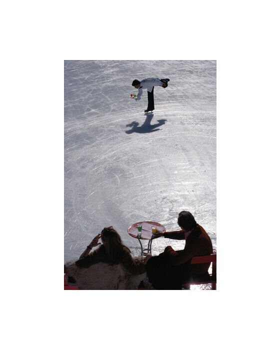 Skating cocktail waiter at the Palace Hotel in St Moritz, Switzerland, captured in March 1978. This artwork is available in various formats including framed in black or white wood, mounted on acrylic glass, or printed on premium photo paper. The prints are based on original color photographs and black-and-white negatives, processed in the darkroom at Getty Images Archive.