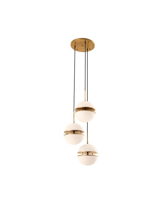 Den eleganta Spiridon taklampan i antik mässing är inspirerad av en futuristisk design från 1960-talet. Med tre skärmar formade som halvor av kulor är denna lampa ett vackert tillskott till hallen, sovrummet eller vardagsrummet.