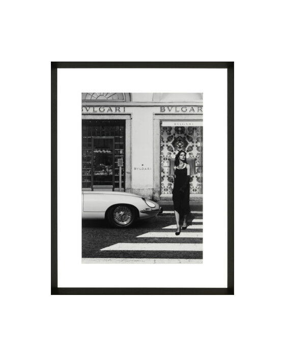 Strolling in Rome är ett tidlöst fotografi som fångar glamour och exklusivitet i en av världens mest ikoniska städer. En självsäker kvinna i svart klänning promenerar förbi Bulgari-butiken, medan en klassisk sportbil står parkerad intill. Bilden förmedlar känslan av italiensk elegans, modehistoria och lyxig livsstil.