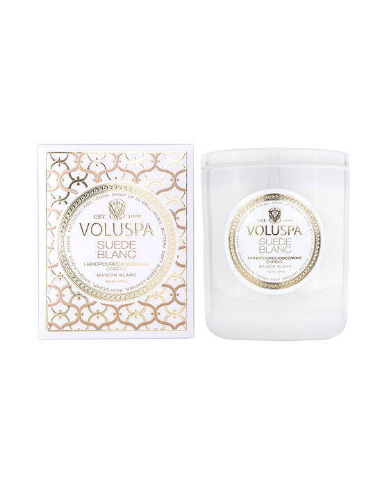 Voluspa Suede Blanc är ett lyxigt doftljus gjord av krämig kokosvax, som gör att ljuset utsöndrar en mycket kraftfull och generös doft. Suede Blanc doftar mjuk mocka med fyllig ceder, vilket ger en exotisk och förfinad doft. Ljuset kommer i en vacker glasbehållare och är förpackat i en fin presentkartong med dekorativt mönster i pastelltoner. Med en brinntid på 60 timmar sprider detta ljus en trivsam och elegant doft i hemmet.