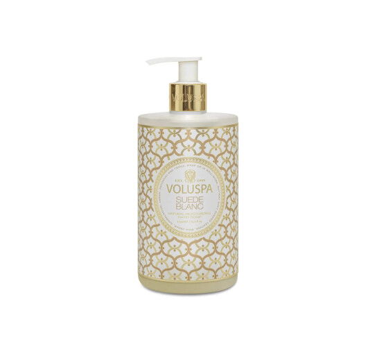 Voluspas lyxiga och mjukgörande handtvål, med en doft av smörigt mjukt läder, cederträ, bärnsten, sandelträ, patchouli och tonkaböna.
