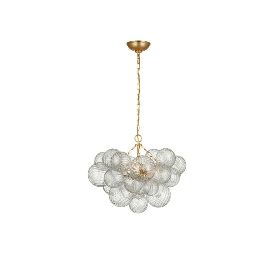 Visual Comfort’s Talia takkrona i guld är en elegant ljusarmatur som ger en lekfull och fantasifull effekt till alla rum. Med sina glasglober dekorerade med virvlar och metallramar tillför den en dynamisk mix av gnistrande glas, mjuka former och blanka metaller till interiören.