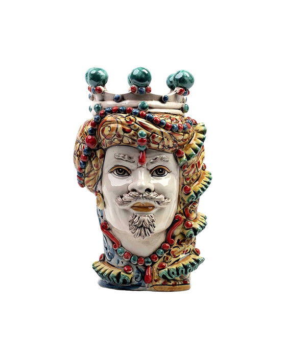 Testa di Moro uomo colored spirals är en handgjord skulptur med en huvudbonad i ett färgglatt mönster och ett ansikte i antikvit. Turbanen är en framträdande detalj i denna modell, med dekorationer som slingrar sig ner mot halsen i en färgvirvel med stark siciliansk karaktär. En krona med gröna kulor och ett rött diadem fulländar denna unika skapelse. Passar både i klassiska miljöer och i moderna, mer färgstarka inredningar.