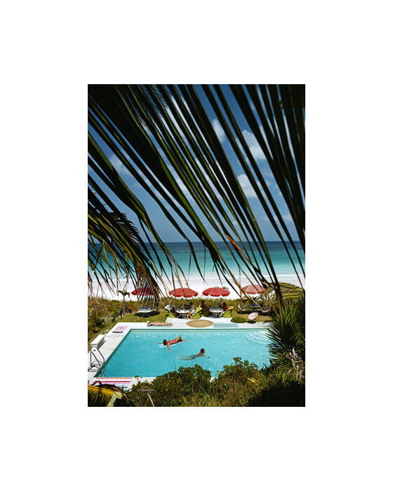 Utforska skönheten i The Bahamas med detta konstverk från Slim Aarons. En pool omgiven av palmträd, människor som simmar och sitter vid poolkanten med en bakgrund av strand och hav.