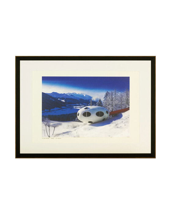 En surrealistisk tavla där retrofuturism möter alpnatur. Mitt i ett vitt snölandskap står det ikoniska Futuro-huset med sina runda fönster och UFO-liknande form. Konstverket är en hyllning till 1960-talets framtidsdrömmar och blir en unik detalj i hemmet som både överraskar och fascinerar.