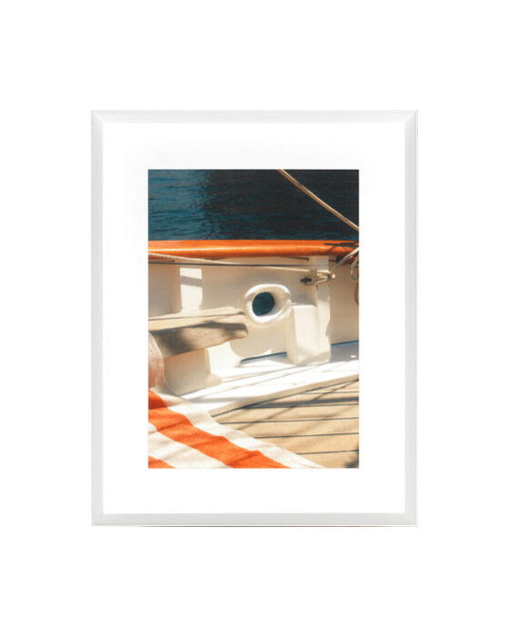 En vacker tavla med motiv som för tankarna till Medelhavets eleganta enkelhet. Bilden av båtens däck, en randig handduk och vattnets djupblå nyanser ger en känsla av lugn och lyx, perfekt för den som vill ha en påminnelse om sommarens stillhet.