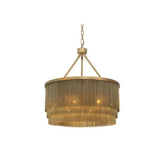 Den lilla Tissot ljuskronan med antik mässingsfinish ger en fantasifull touch till ditt utrymme med sin iögonfallande design. Kedjorna påminner om fransklänningar från 1920-talet och ger en glamorös känsla liknande The Great Gatsby. Perfekt att kombinera med de stora Tissot ljuskronorna för extra dimension.