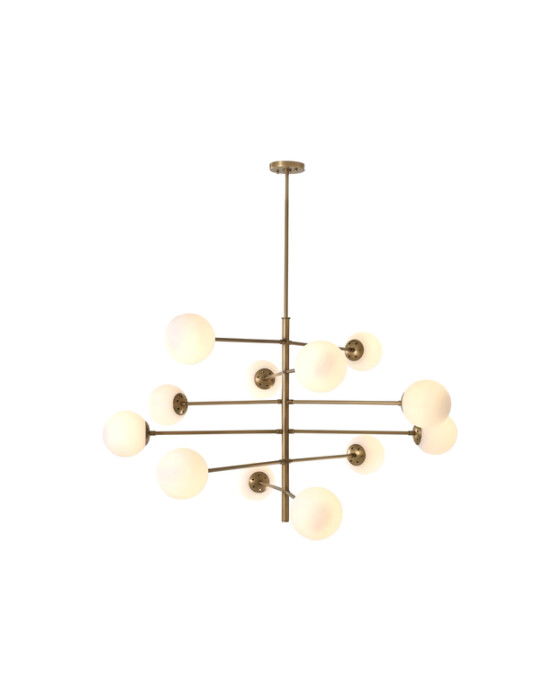 Skapa en retrokänsla i ditt vardagsrum med underbara Tortora taklampa. Lampan ger ett fint fördelat ljus från varje glaskula i vitt glas. Stommen är tillverkad av metall och har en vacker finish i antik mässing.