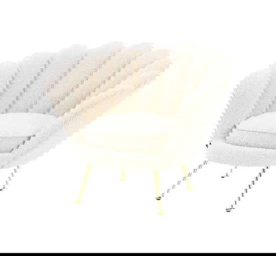 Koppla av i den eleganta fåtöljen Trapezium, som beundras av många gäster. Formgivningen liknar en vacker snäcka som är klädd i ett ljust bouclétyg. Fåtöljen är dekorerad med stiliga mässingben som andas vintage och glamour. Tygets härliga struktur är skapad av tvinnat garn som ger ett lockigt och virvlande intryck.