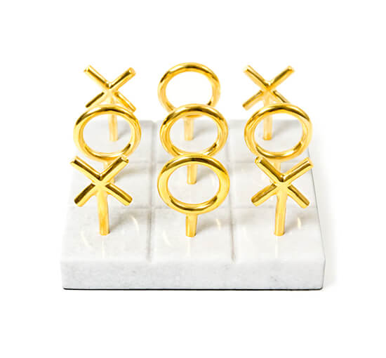Det exklusiva och dekorativa tre i rad-spelet i mässing har en stilren och modern design. Spelbrädet är tillverkat i vit marmor med pjäser i solid mässing, vilket ger spelet både underhållning och estetiskt tilltalande utseende.