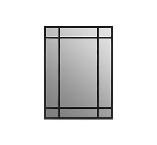 Den fönsterlika spegeln i robust svart ekfanér från Artwood ger rummet en känsla av större utrymme och mer ljus. Den ingår i Trent-serien som erbjuder olika möbler och inredningsdetaljer för en komplett stil.