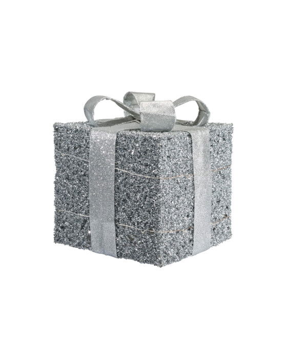Upplyst juldekoration i form av ett glittrande silverfärgat paket med LED-lampor, perfekt för att skapa en festlig atmosfär i hemmet.