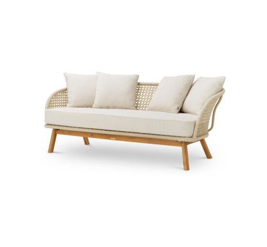 Upplev en enastående sofistikerad känsla med den utomhussoffa Trinity. Denna lyxiga möbel har Flores off-white klädsel, elegant flätad med en krämfärgad repdetalj och förankrad med elegant naturteak. Dess förfina design och fylliga kuddar erbjuder det ultimata inom utomhuslyx, inbjudande till skön avkoppling. Perfekt för de som söker tidlös skönhet och suverän komfort i sin utomhusoas.