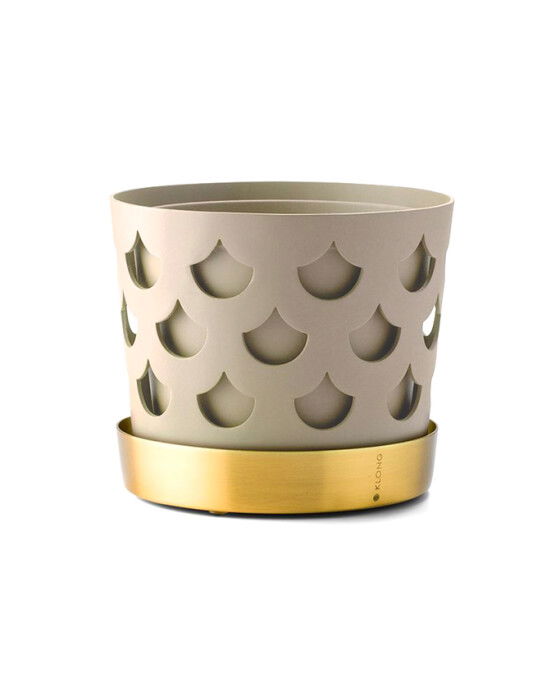 Den vackra blomkrukan Trio Drop från Klong, designad av Ania Pauser, har ett droppformat mönster som ger karaktär och djup. Varje kruka består av tre delar; innerkruka, ytterkruka och fat. Tillverkad av tunn plåt med en matt porslinsaktig yta, med ett fat av mässing.