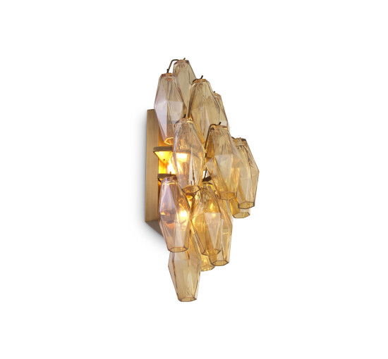Vägglampa Benini har en förtrollande charm och skönhet i en briljant design. Denna vackra vägglampa med antik mässingsfinish har diamantformade rör av bärnstensfärgat glas som låter ljuset falla igenom och skapar en fascinerande ljusbild på din interiör.