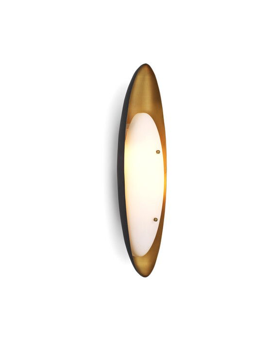 Den stilrena Venova vägglampan i antik mässing från Eichholtz har en futuristisk design som kommer att addera elegans till ditt rum. Med en svart baksida och en framsida i antik mässingsfinish ger denna lampa ett varmt och behagligt ljus genom sitt vitt glas. Lampan är avsedd för fast installation och har en diskret kabel som försvinner bakom väggplattan.