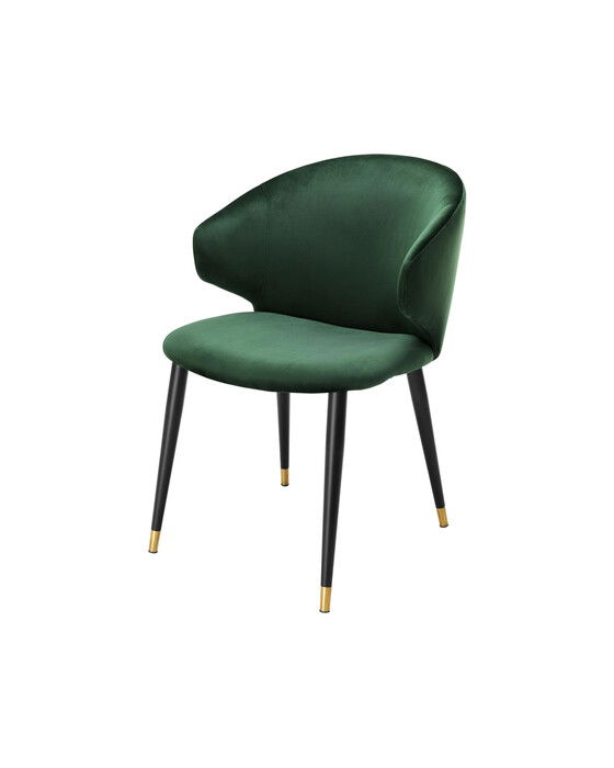 Ge din matsal ett lyft med den eleganta Volante matstolen i roche mörkgrön sammet. En bekväm stol med böjd rygg som ger en touch av Mid Century-stil.