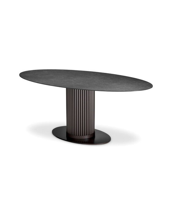 Upptäck mångsidigheten hos Eichholtz’s Volterra matbord, som förenar lyx med praktisk användning för både inomhus- och utomhuselegans. Denna produkt har en stadig pelare med bronsfinish och en keramisk oval skiva som efterliknar en förfinad marmorlook, perfekt för att höja alla matutrymmen med sin sofistikerade närvaro.