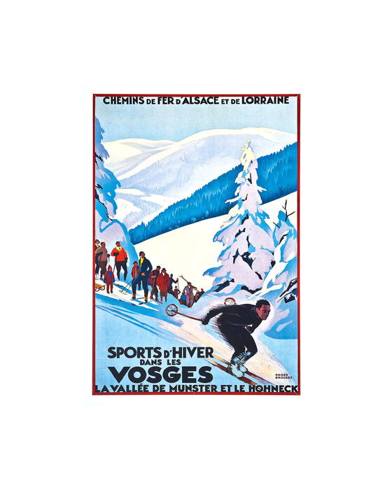 En fantastisk vintage-tavla som hyllar vintersportens charm i de natursköna Vogeserna. Den ikoniska illustrationen fångar skidåkare och vandrare som njuter av de snöklädda bergen i Alsace och Lorraine, med dramatiska färgkontraster som skapar en känsla av rörelse och gemenskap. En perfekt tavla för retrodesign-älskare och de som uppskattar alpina landskap.