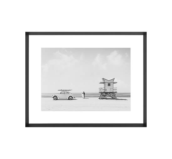Waiting for the Waves är en stämningsfull fototavla i svartvitt som fångar känslan av stillhet vid havet. Motivet visar en klassisk bil med surfbräda parkerad bredvid ett livräddartorn, med en ensam figur som blickar ut mot horisonten i väntan på nästa våg. Tavlan för tankarna till drömmar, frihet och lugn, och blir en vacker detalj i hemmet, vare sig det är i vardagsrummet eller sommarstugan. Levereras med svart träram.