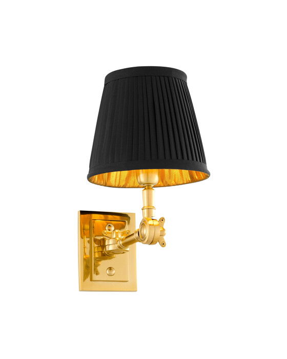Skapa en stämningsfull atmosfär med Wentworth vägglampa från Eichholtz. Välj vägglampa med omsorg och ge rummet det lilla extra med en eller flera vägglampor och skapa en skön harmonisk balans mellan ljus och mörker. Vägglampan har en gedigen stomme av mässing med en elegant plätering i guldfärg vilket ger lampan en exklusiv look. Lampskärmen är tillverkad av polyester och inkluderas vid köpet. Vägglampan är avsedd för fast installation och måste kopplas direkt till en elsladd som dras från väggen. Kabeln på lampan sitter bakom väggplattan och kommer inte vara synlig efter att lampan fästs på väggen.