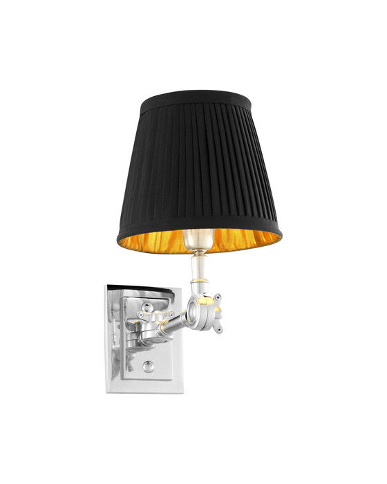 Skapa en stämningsfull atmosfär med Wentworth vägglampa från Eichholtz. Välj vägglampa med omsorg och ge rummet det lilla extra med en eller flera vägglampor och skapa en skön harmonisk balans mellan ljus och mörker. Vägglampan har en gedigen stomme av mässing med en elegant plätering i nickel vilket ger lampan en exklusiv look. Lampskärmen är tillverkad av polyester och inkluderas vid köpet. Vägglampan är avsedd för fast installation och måste kopplas direkt till en elsladd som dras från väggen. Kabeln på lampan sitter bakom väggplattan och kommer inte vara synlig efter att lampan fästs på väggen.