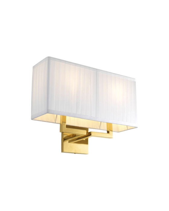 Westbrook vägglampa i guld är en elegant och stilren lampa som passar perfekt i olika inredningsstilar. Med en vit plisserad skärm skapar den ett behagligt ljus i rummet och ger en touch av lyx.