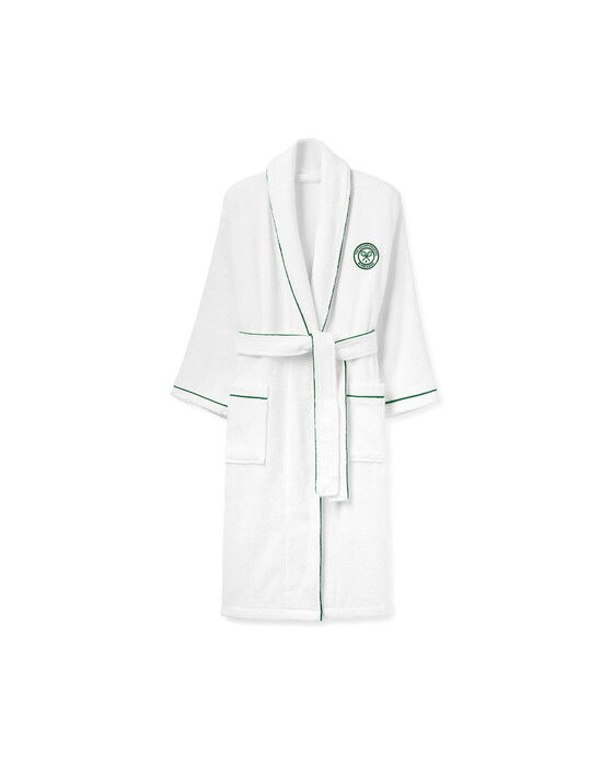 Den vita Baseline-morgonrocken är inspirerad av Wimbledon-estetiken och kombinerar loungewear med en sportig silhuett. Tillverkad i absorberande bomull med gröna pipingdetaljer och det broderade Wimbledon-emblemet på bröstet, är denna morgonrock en diskret hyllning till tennisens mest ikoniska turnering.