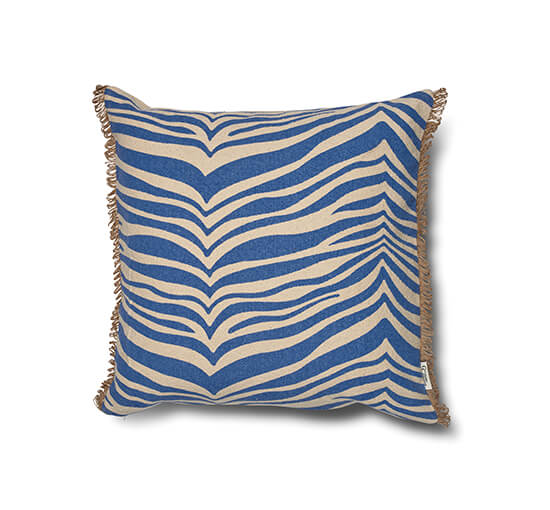 Zebra blå kudde är en elegant kudde med ett klassiskt zebramönster, tryckt för hand på 100% bomull. Kudden pryds av en dekorativ jutekant som ger en naturlig och stilfull touch. Den har en enfärgad baksida och är försedd med en praktisk dragkedja längs sidan för enkel av- och påtagning.