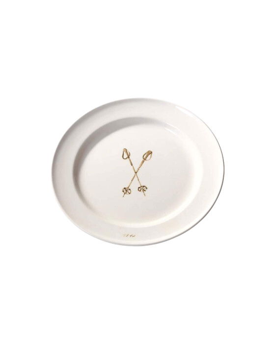 Zermatt assiett är tillverkad i glaserat stengods med en vit, lätt glänsande yta och har ett tydligt formspråk. Assietten har en handritad design av två korslagda skidstavar i mitten, vilket ger den en personlig men nedtonad karaktär. Med sin låga kant och nätta storlek är assietten perfekt för förrätter, efterrätter eller en enkel smörgås. Passar både för vardagsbruk och när du vill duka lite extra omsorgsfullt.