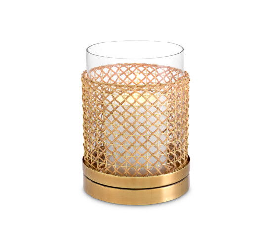 Zimmerman ljuslykta är tillverkad av naturlig rotting och har en antik mässingsfinish, och är en fantastisk inredningsdetalj som utstrålar modern elegans. Dess intrikata vävda design ger en touch av glamour var den än placeras. När den kombineras med den större Zimmerman ljuslyktan får du en balanserad och sofistikerad look.
